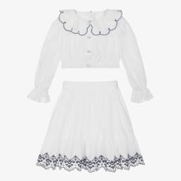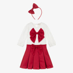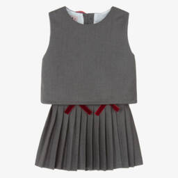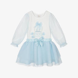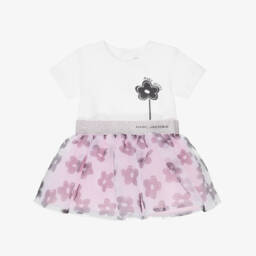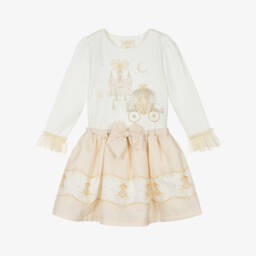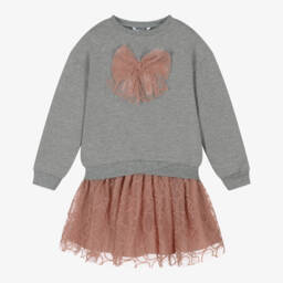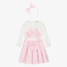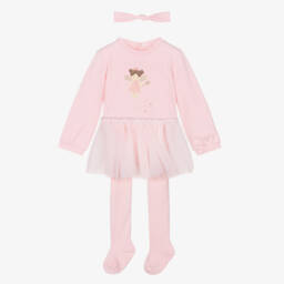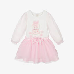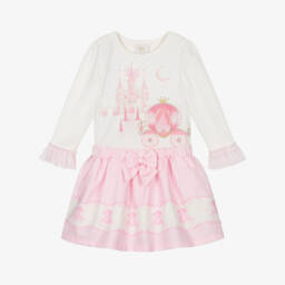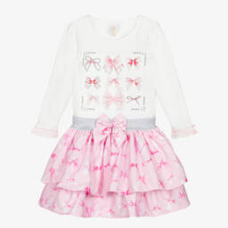 A gorgeous pink skirt set for girls by Caramelo Kids. Made in soft jersey, the top features a delightfully chic shoe illustration, embellished with faux pearl beads and sparkly diamantés. It has puffed short sleeves and delicate tulle trims. Lined for comfort, the tutu-style skirt is designed in gathered tiers of soft tulle for a voluminous look.
