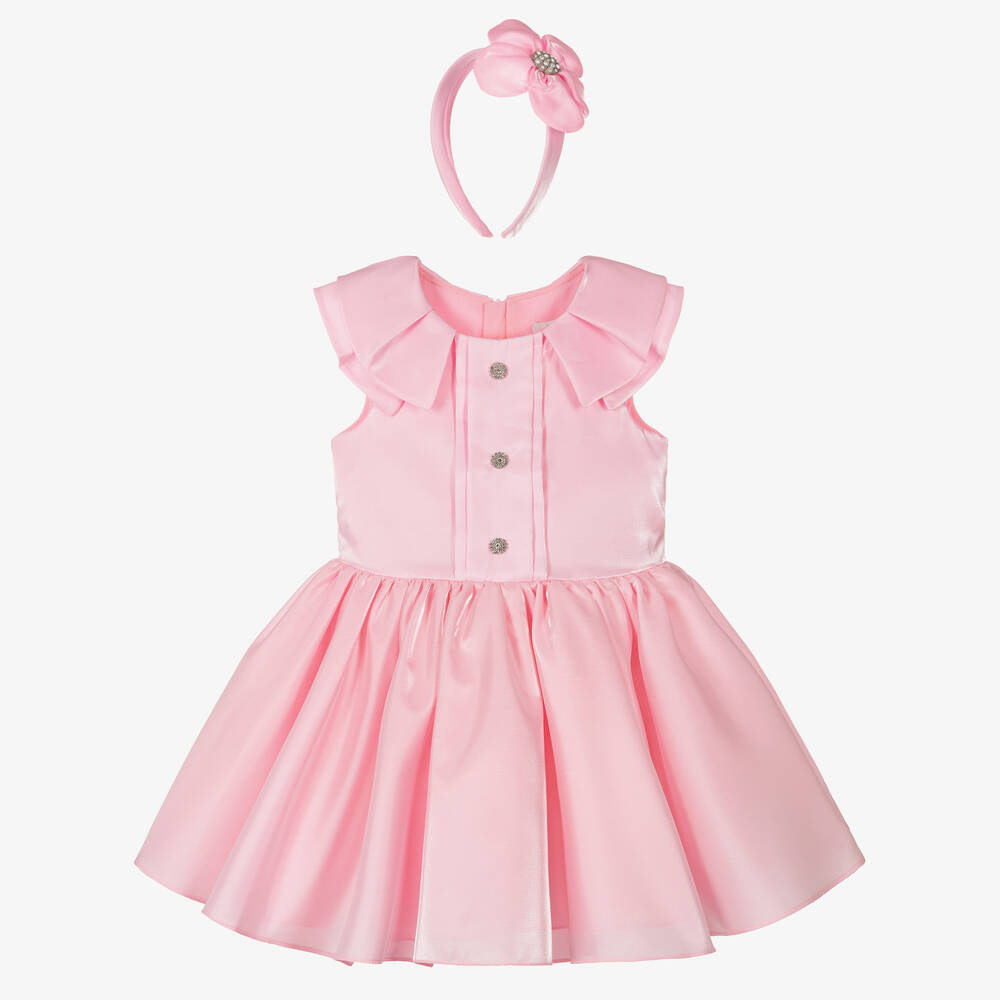 Lustrous pale pink satin dress set for girls by Caramelo Kids, with an eye-catching sheen. It has a double collar, decorative, sparkly diamanté buttons on the front and a full, gathered skirt with tulle petticoats for lots of volume. It fastens with a zip and a sash that has a fixed bow on the back. A coordinating hairband completes the set.