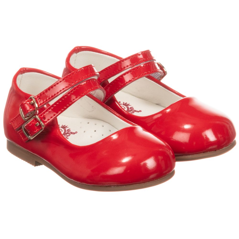 Red first walker shoes for baby girls by Caramelo Kids. Made in smart patent leather, they have double strap, buckle fastenings. The lining and padded insole are made in soft leather. The outer rubber sole is non-slip.