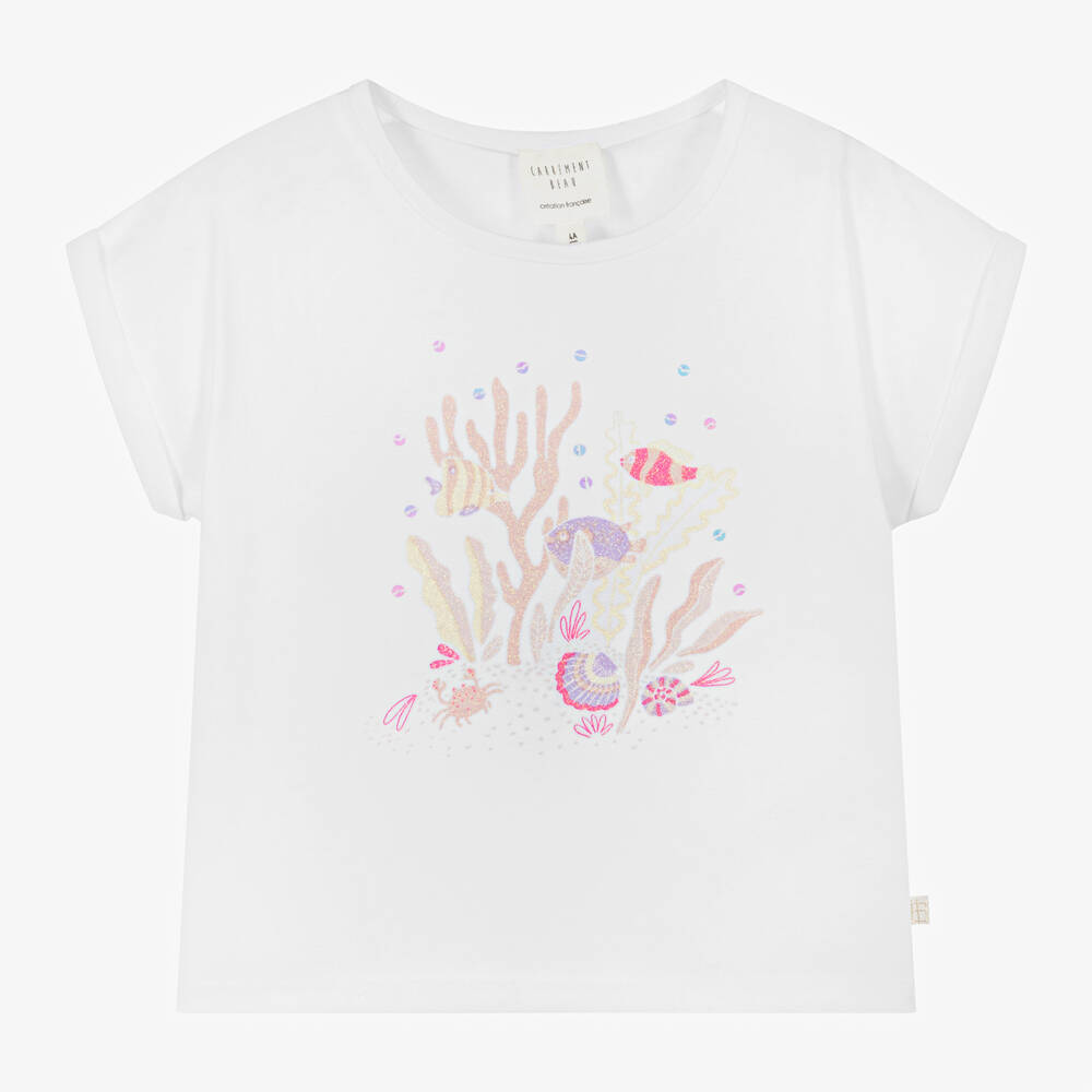 A simple yet pretty white T-shirt for girls by French brand Carrément Beau. It has a pink and purple sea creature motif on the front, embellished with sparkly glitter and iridescent sequins. Made in soft organic cotton jersey, this boxy fit tee has seamless short sleeves.