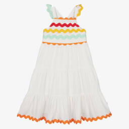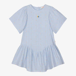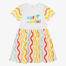 Pink cotton dress for girls by Catimini, capturing playful charm with its vibrant design. Made in lightweight poplin, it showcases a delightful red love heart pattern. This timeless style has puffed sleeves and a tiered skirt, with a red band and appliqué bow defining the waist. It is lined with cotton and fastens with a neat, concealed zip ensuring comfort and style.