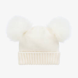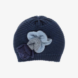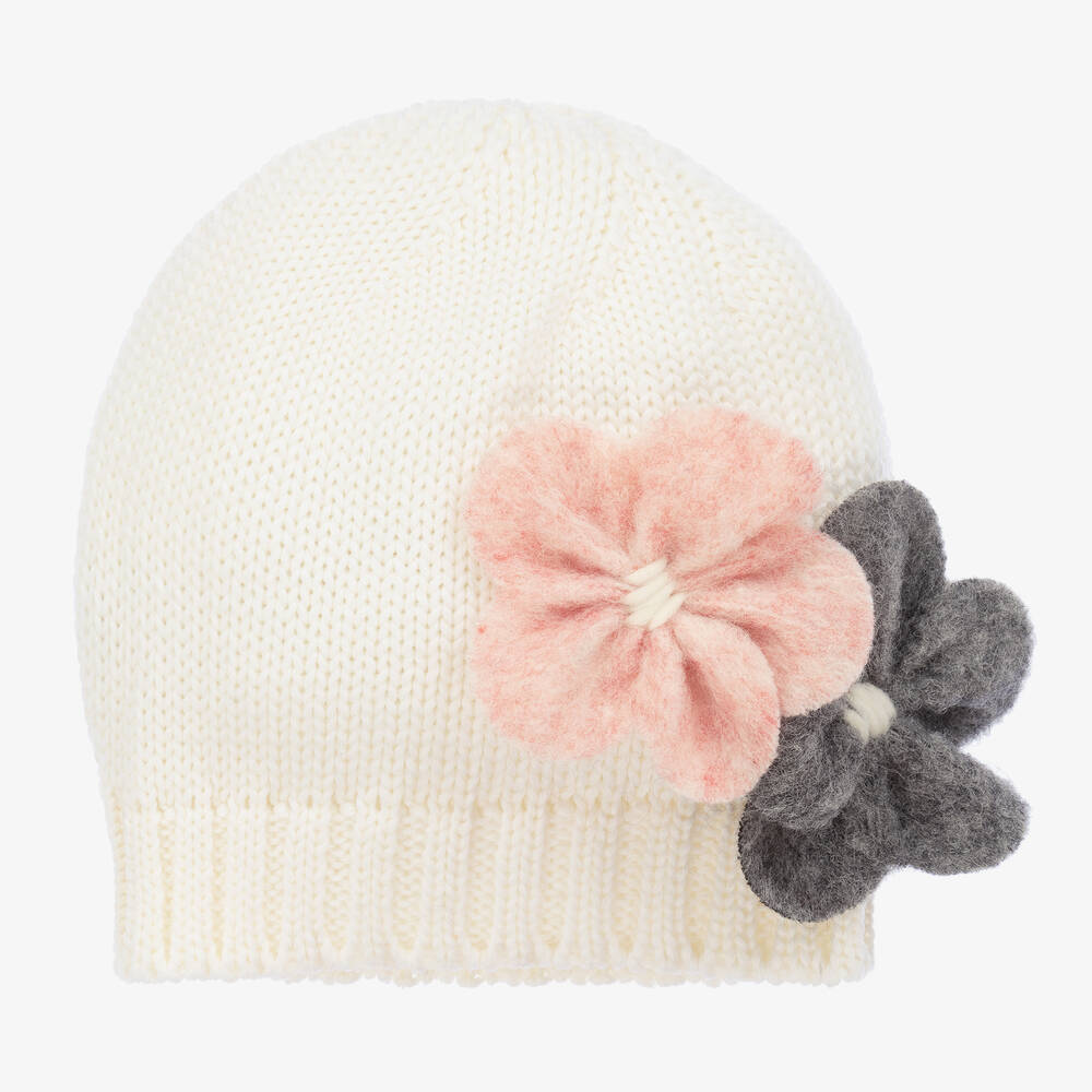 Cosy and warm, this lovely ivory hat for girls is by Italian brand Catya. It is knitted in luxuriously soft Merino wool with a gently ribbed brim. The front is decorated with gorgeous pink and grey knitted flowers with a soft felted feel.