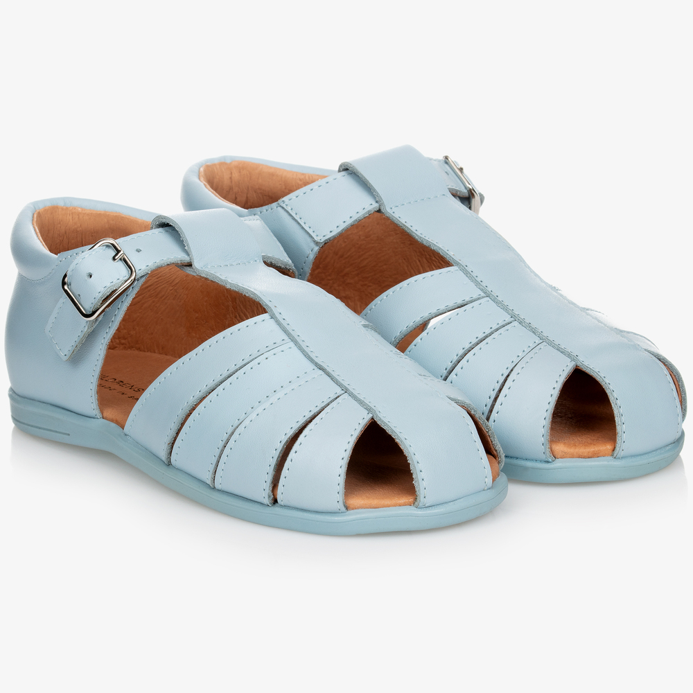 Exclusive to Childrensalon, a pair of pale blue leather closed toe sandals for boys and girls by Children's Classics. They have a shaped leather inner sole for support and non-slip rubber soles. The buckle fastening strap can be adjusted for a good fit.