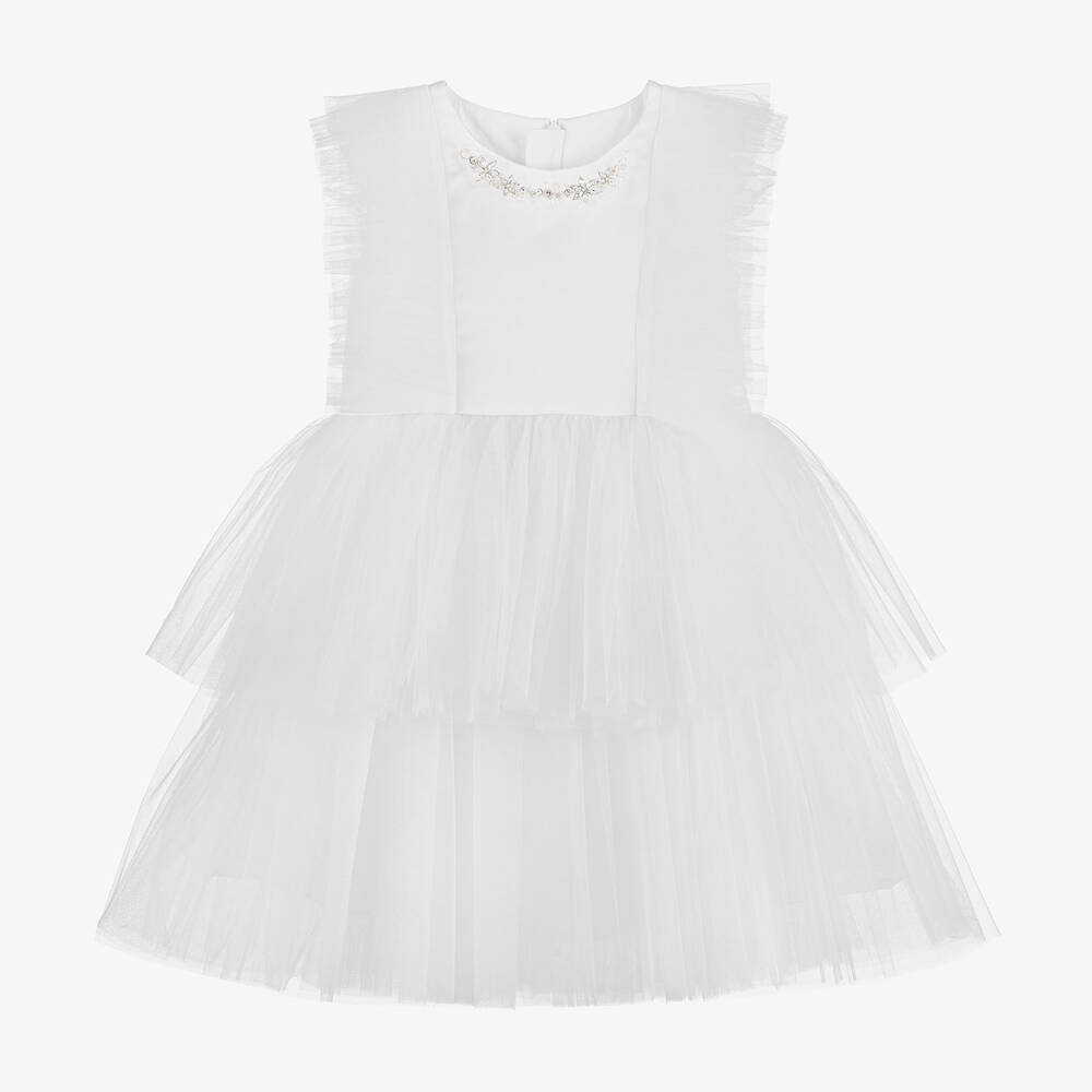 Gorgeous white special event dress for girls by Childrensalon Occasions, with crystal flowers and pearl beads around the neckline. The satin bodice has pleated tulle frills over the shoulders and there are layers and layers of tulle on the skirt, creating lots of volume. The dress is fully lined in cotton for comfort.