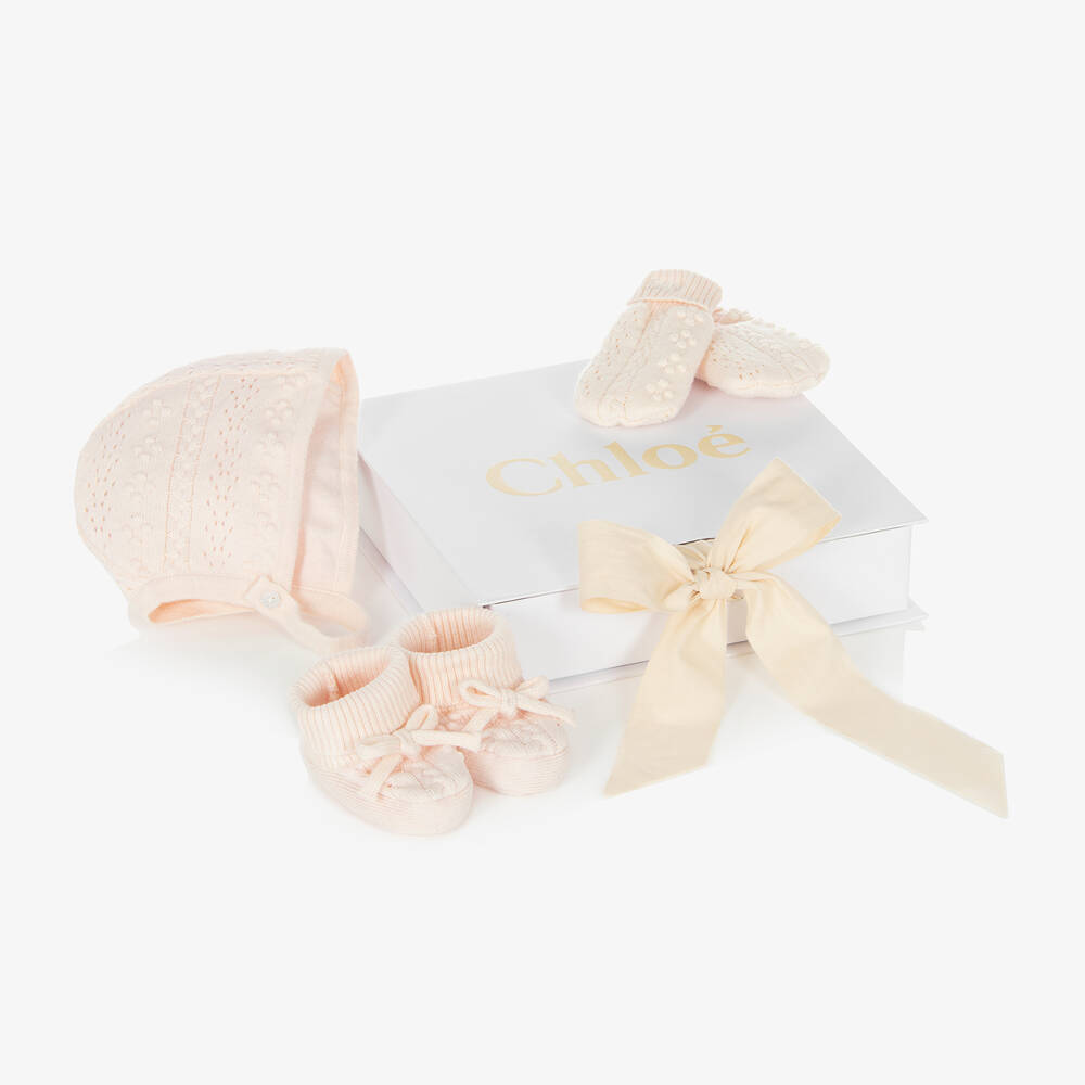 Gorgeous pale pink hat, mittens and booties gift set for baby girls by luxury French brand Chloé, knitted in a soft organic cotton and wool blend. All three pieces are patterned with a lovely cable knit, pointelle and bobble design and are all presented in a beautiful gift box with a sweet note from the designer. The booties have bows on the front and ribbed cuffs, one with an embroidered logo. The mittens also have an embroidered logo on one ribbed cuff and are attached to a useful string to prevent them getting lost. The warm and cosy double layer hat fastens with a button under the chin.