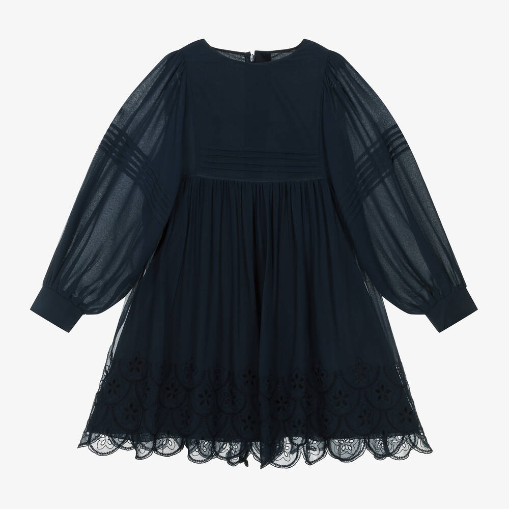 Navy blue dress for girls by Chloé, made in the softest silk georgette and lined with cotton. Beautiful and elegant, the balloon sleeves are semi-sheer, the scalloped hem is decorated with gorgeous broderie anglaise, and there are classic pin tuck details. The Chloé logo is embroidered subtly above the hem in tonal thread. This timeless look has a hidden zip on the back, a thoughtful design which does not distract from the beauty of the dress.