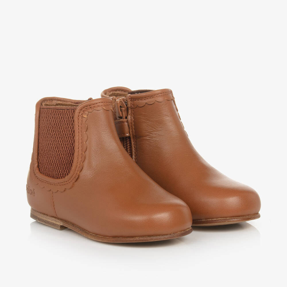 Tan brown leather Chelsea boots for little girls by luxury French brand Chloé. They are edged in the designer's signature scalloped detailing and have an engraved Chloé logo at the heel. This classic style has an elasticated panel on one side for easy slip on, with a zip fastening on the other. There is a leather lining and insole, with rubber inserts on the leather sole for added grip.