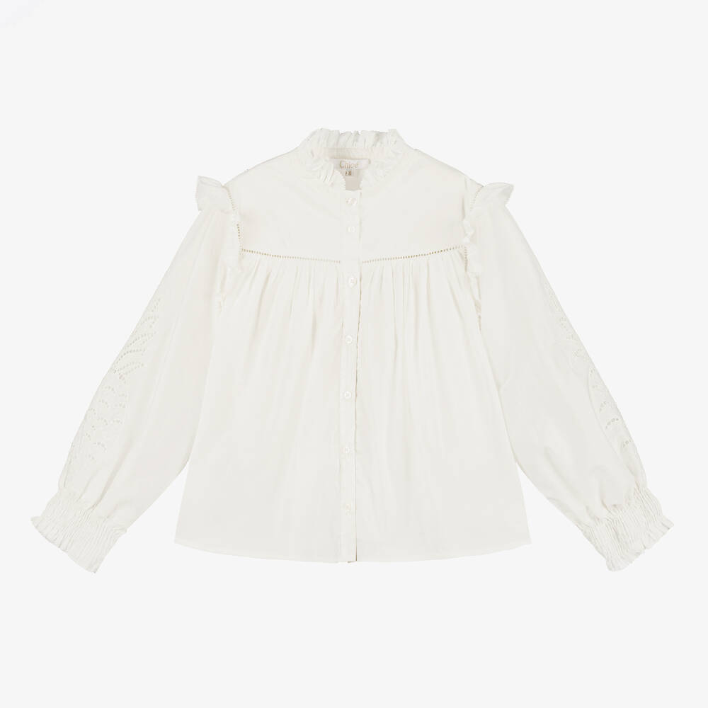 Beautiful ivory blouse for girls by Chloé, made and lined in soft and lightweight cotton, with pretty ruffle trims. The puffed sleeves, with shirred elastic cuffs, feature the French brand's archival pineapple motif in delicate embroidered cutwork detail. The label's distinctive ladder lace trims the bodice, and the blouse falls in gathers for a relaxed silhouette. Branded button fastenings and an embroidered logo above the hem add a subtle designer touch.
