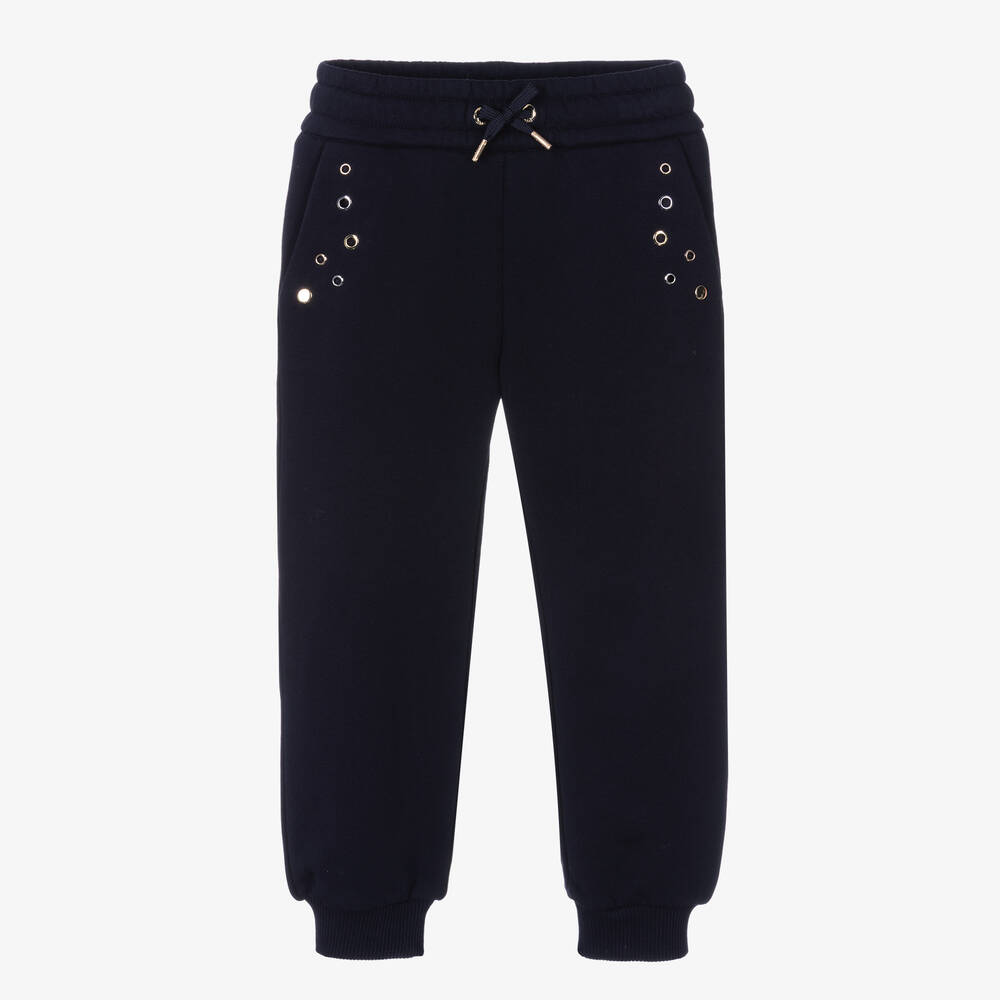 Navy blue joggers for girls by luxury designer Chloé, made in mid-weight organic cotton jersey. Inspired by the adult collection, these comfortable joggers are detailed with iconic silver and gold eyelets on the pockets and are discreetly signed with tonal embroidery on the back. They have an easy drawstring waist and lightly ribbed cuffs for a casual silhouette.