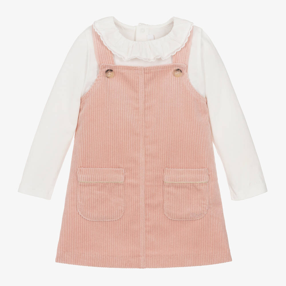 Ivory and pink pinafore dress set for little girls by luxury brand, Chloé. Made in soft organic cotton jersey, the long-sleeved top has a ruffle collar and fastens with easy-to-use poppers on the back of the neck. The corduroy dress has sweet shimmery gold accented pockets, with tonal logo embroidery detailing one of them. There are faux tortoiseshell buttons on the popper fastening straps for a stylish finish.