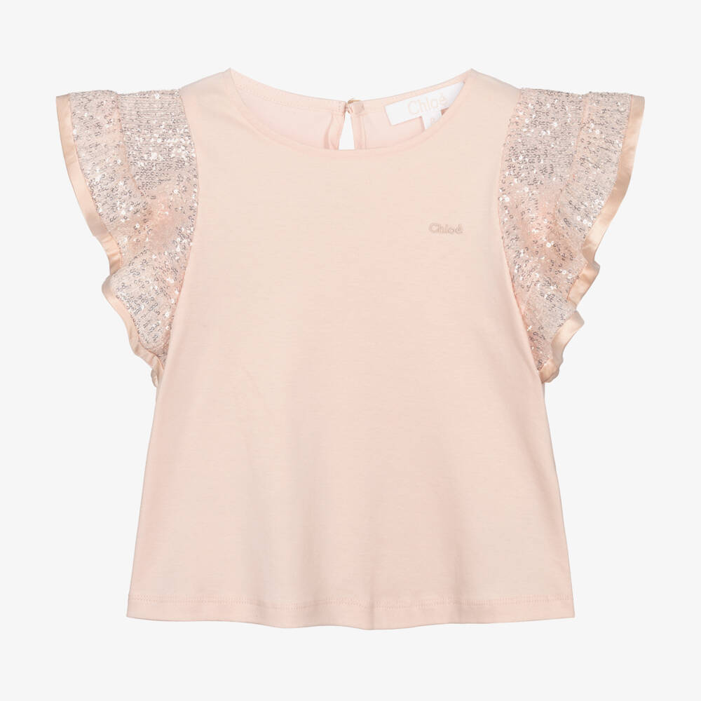 Pretty pale pink T-shirt for girls by luxury designer Chloé, made in soft cotton jersey. It has chic angel sleeves, beautifully embellished with shimmering sequins. The signature Chloé logo is embroidered on the chest and a gold button on the back of the neckline adds a delicate finishing detail.