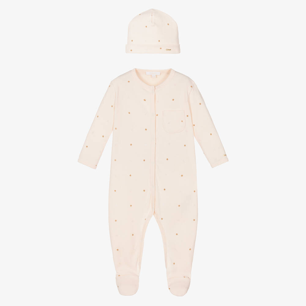 A pale pink babygrow set for girls by luxury French brand Chloé, made from the softest organic cotton jersey. It is patterned in the designer's signature floral design with Chloé letters discreetly signed throughout. It fastens neatly with poppers and comes with a matching hat with a sweet gold foil logo.