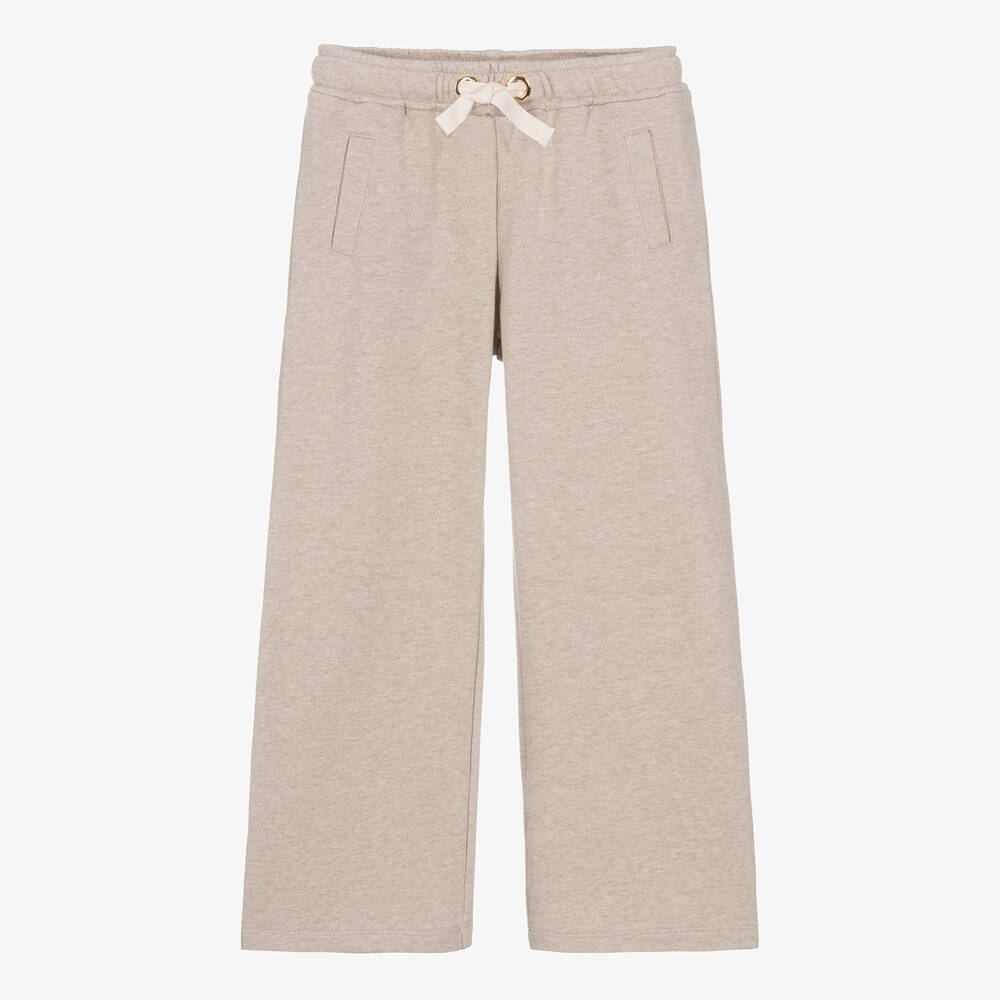 Beige marl organic cotton joggers for teen girls from renowned luxury label Chloé, with logo embroidery on the back. In the designer's famous bohemian style, these neutral-toned joggers have ivory ribbon drawstrings on the elasticated waist, with golden eyelets and end caps. Great as casual or loungewear, they are made in soft and stretchy sweatshirt jersey. In a wide-leg silhouette, the design is complete with useful front pockets.