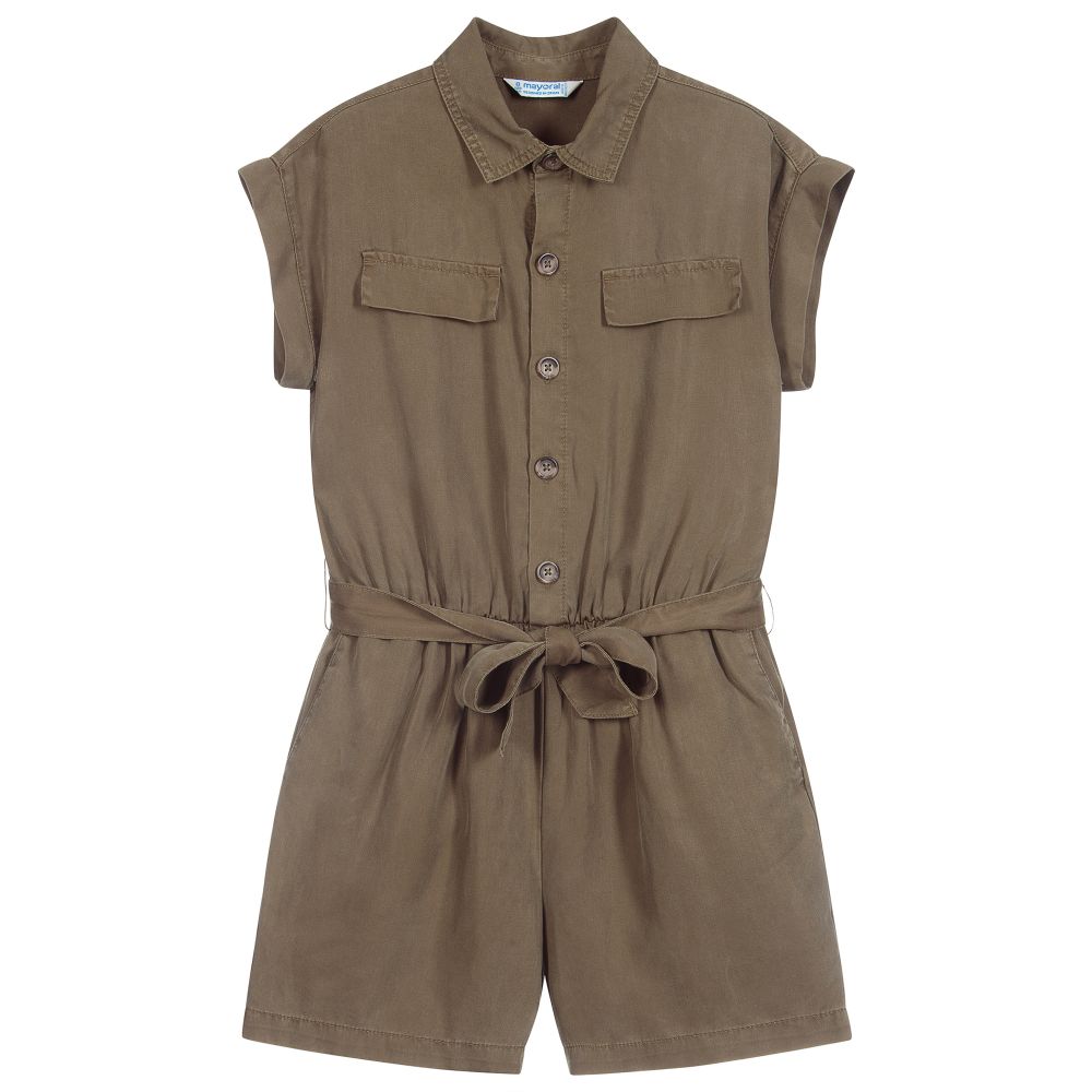 A stylish khaki green jumpsuit for girls by Mayoral, made from super soft lyocell. Lightweight, it has small flaps on the front, wit faux horn buttons. There is a small pointed collar and a fixed tie fastening belt around the lightly elasticated waist.
