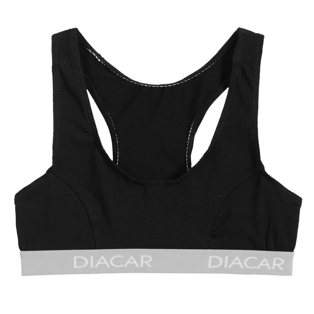In a cool yet simple style, this black bra top for girls is by Diacar. Made from soft cotton jersey, it has a comfortable racer back design and a grey elasticated logo trim at the bottom.