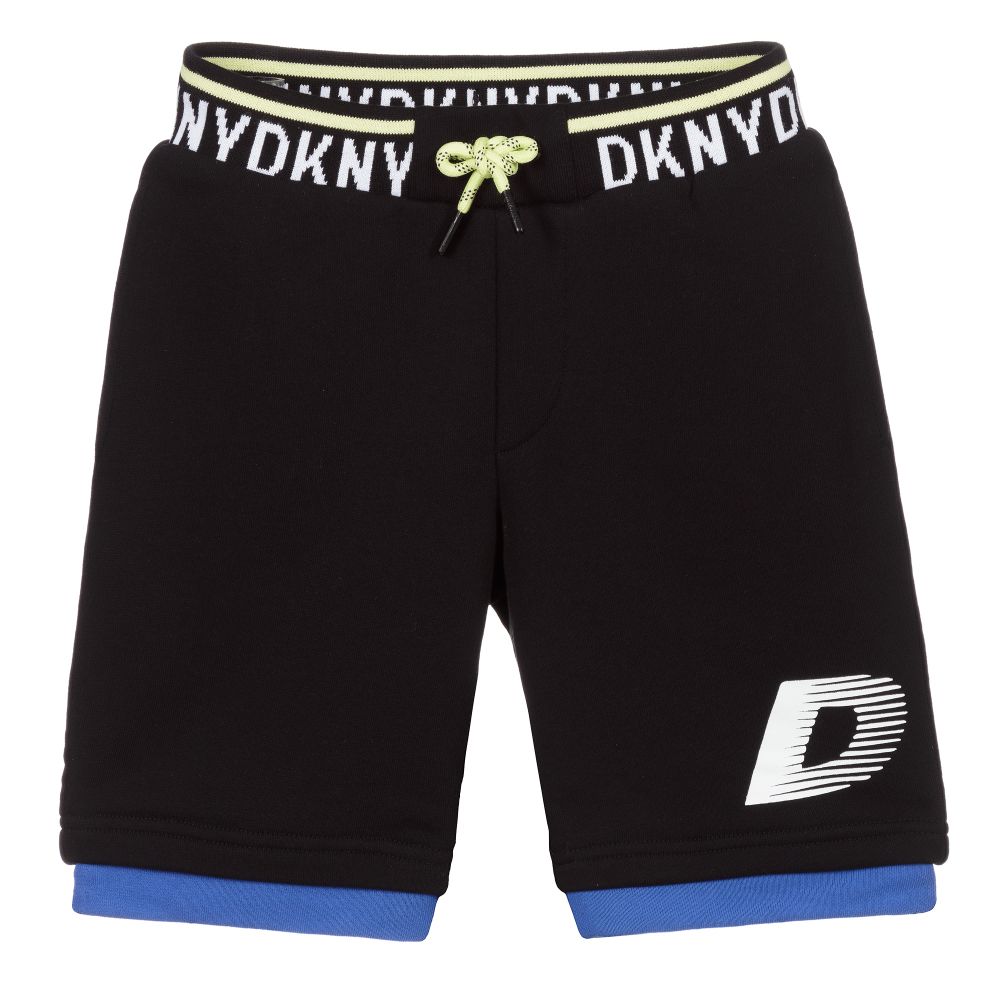 Boys black cotton jersey shorts with bright blue trim, by DKNY. Bermuda length, they are soft and stretchy and have an elasticated, knitted jersey waistband with a yellow stripe and white logo detail. There is a white logo print on the hem and two side pockets.