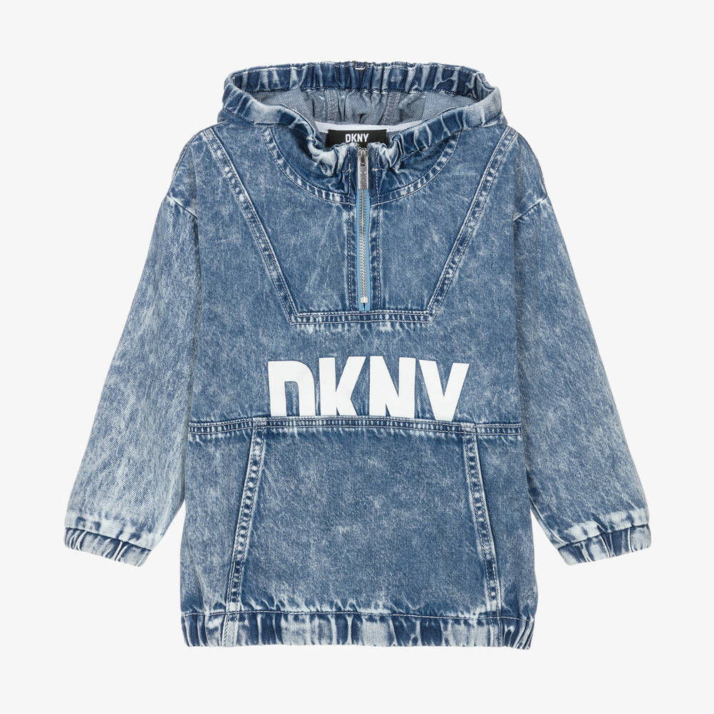 Boys and girls blue hoodie by DKNY, with a 90's inspired acid wash effect. Made in soft, non-stretch cotton denim, this long-sleeved style has a heavily-stitched effect and front pouch pocket. A bold white logo print across the chest adds undeniable designer flair to the top. It has a quarter zip fastening on the chest for easy dressing and cool style, and elasticated trims for comfortable wear.