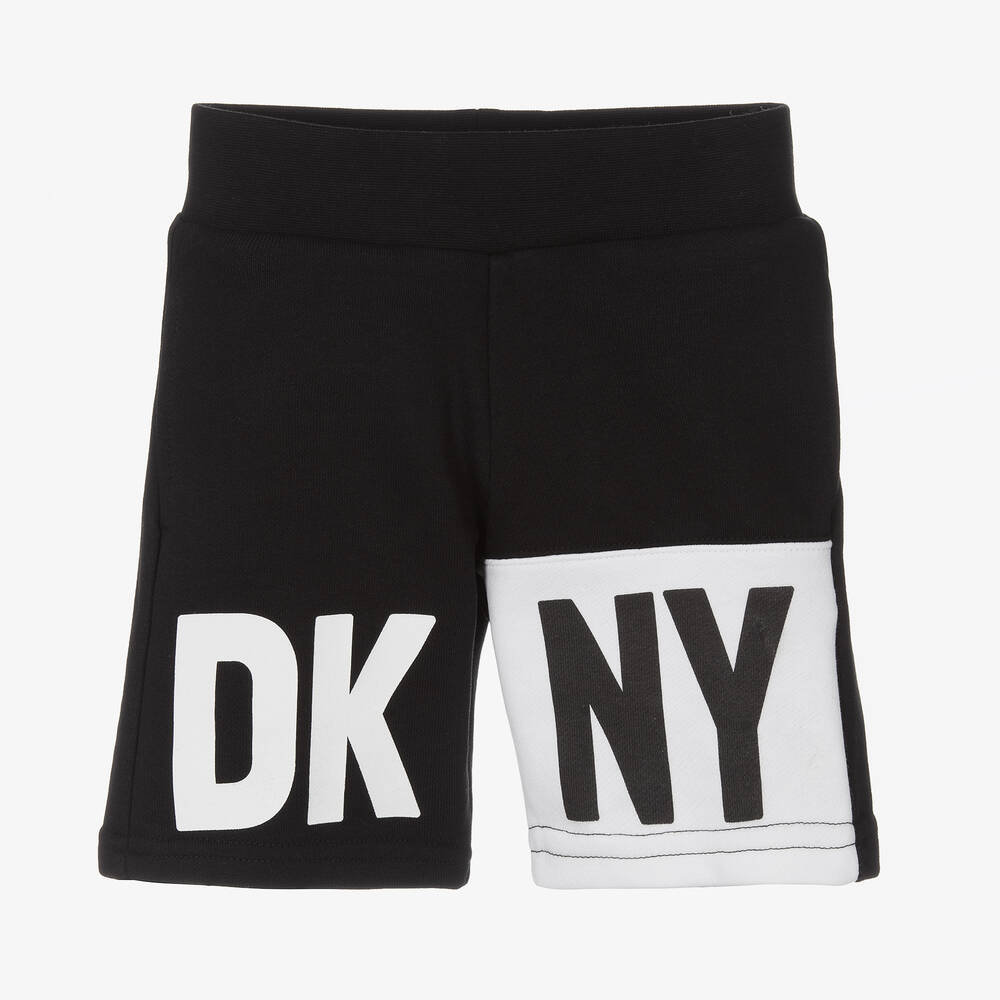 Black with a white panel insert, these casual shorts for boys are by DKNY. They are made in soft mid-weight cotton jersey and have comfortable elasticated waist. There are concealed side seam pockets, with a statement white logo print across both legs.