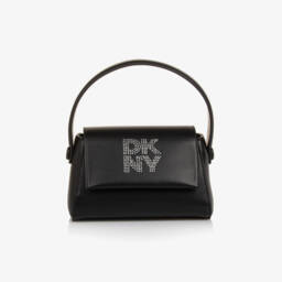 Reversible shoulder bag for girls by DKNY. Silky smooth, this fun accessory is black on one side and bright fuchsia pink on the other. Both sides have white logo prints. The shoulder strap is made from cord and can be pulled to secure the top of the bag.