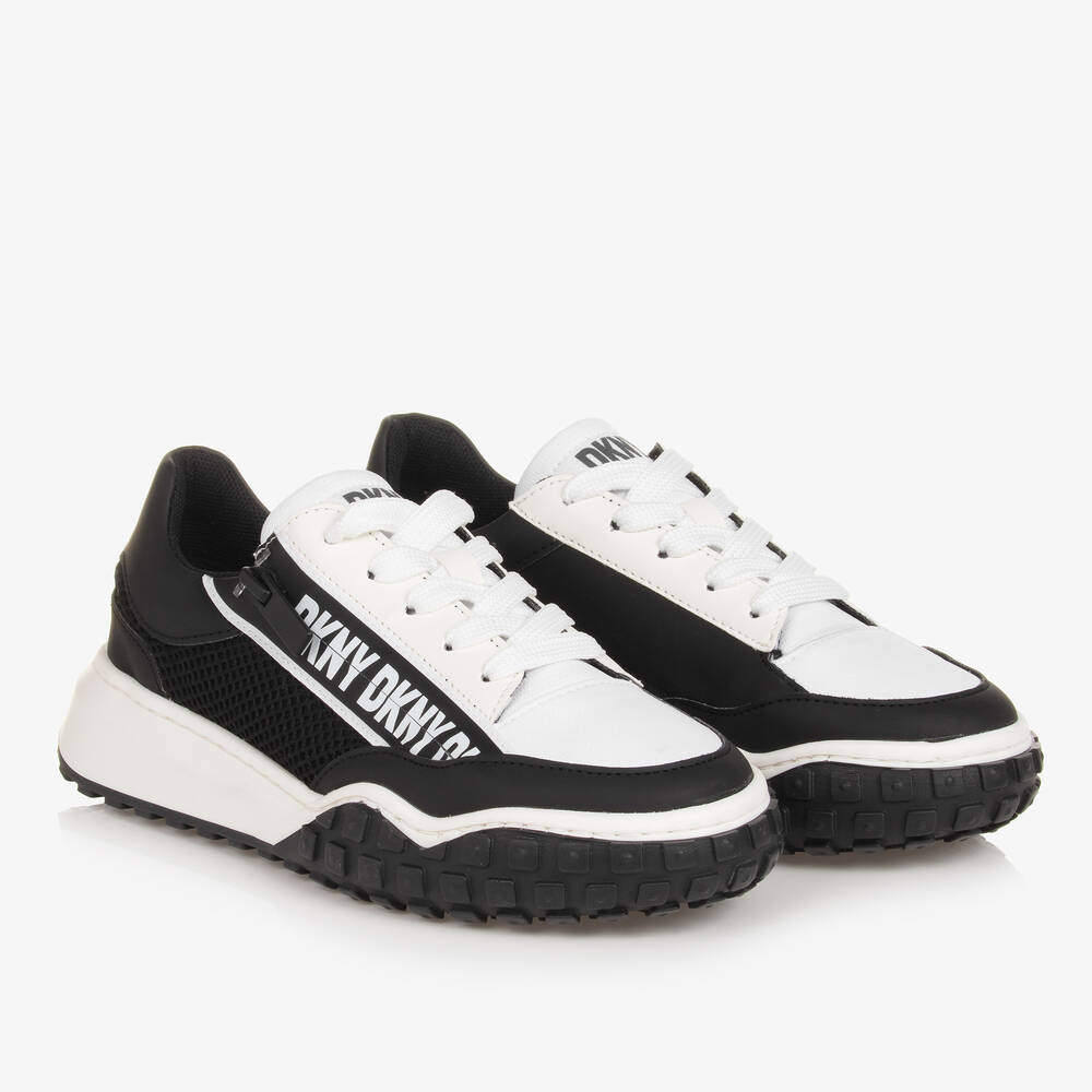 Designed with DKNY's distinctive monochrome style, these black and white trainers are for teen boys and girls. Instantly recognisable, they have contrast logo prints on the tongue, side and heel. They fasten with laces for an adjustable fit and have convenient side zips for ease and speedy changes. The upper is made in a combination of faux leather and mesh, and they are lined in soft mesh with a removable cushioned insole. The outer sole continues the monochrome theme and is stylishly textured for good grip.