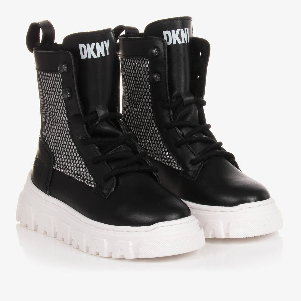 On-trend black lace-up boots for teen girls by DKNY. These stylish boots feature the brand's signature logo print on the tongue, with an embossed logo on the side, for extra designer appeal. Made from smooth leather, they have glittery silver mesh panels and are partially lined with faux shearling. A chunky white rubber outer sole gives a bold finish to this cool design.