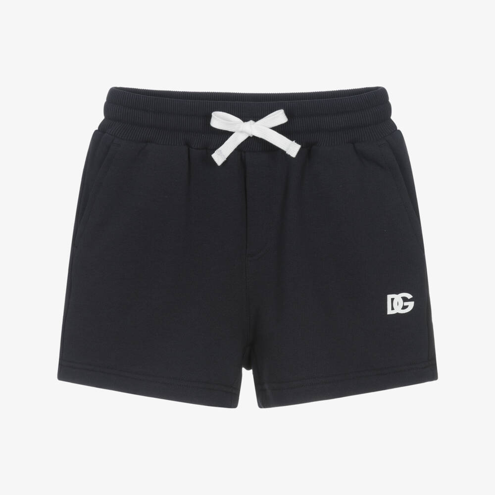 Navy blue shorts for boys by luxury Italian brand Dolce & Gabbana, made in soft, mid-weight cotton jersey. Casual and comfortable, they have slanted front pockets and a patch pocket on the back with a rubberised white logo. There is a white DG logo on the front and a useful drawstring waist for a great fit.