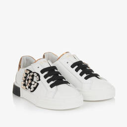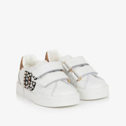 In white and beige with bright blue trims, these stylish trainers for boys are by luxury label Dolce & Gabbana. Made in soft mesh and suede leather, they have the iconic DG logo in red on one side, with additional branding on the tongue and back of the heel. Fastening with laces, they have a smooth leather insole and a treaded rubber sole for good grip.