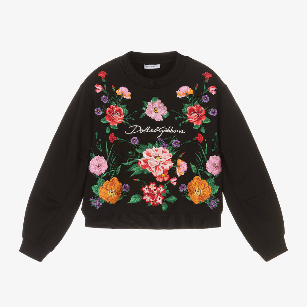 Girls Black Embroidered Floral Cotton Sweatshirt