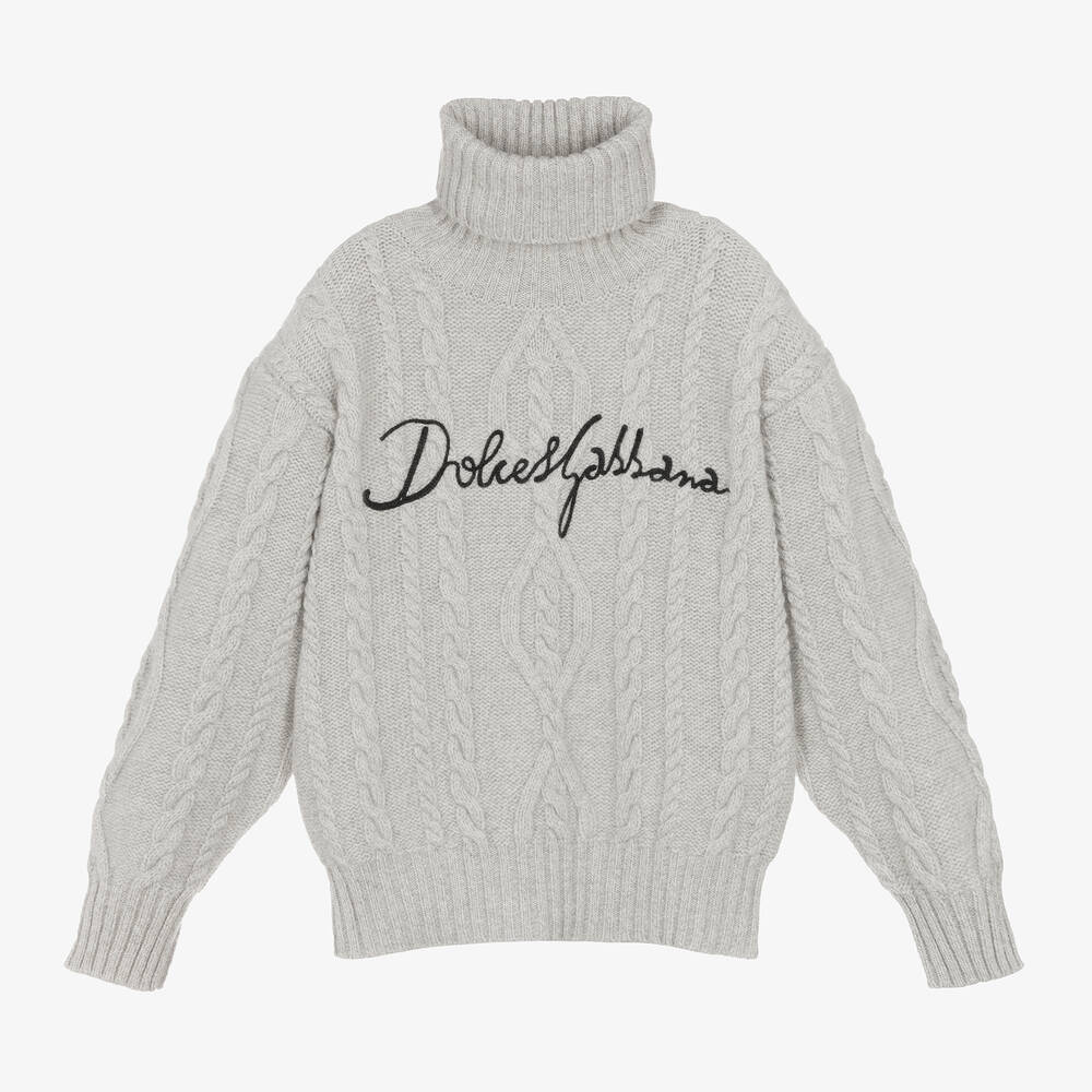 Epitomising luxury, this grey roll neck sweater for older boys and girls is designed by Dolce & Gabbana, the iconic Italian fashion house. Knitted in an exquisite virgin wool and cashmere blend, it has deep, ribbed details and a signature script logo embroidered across the chest in black.