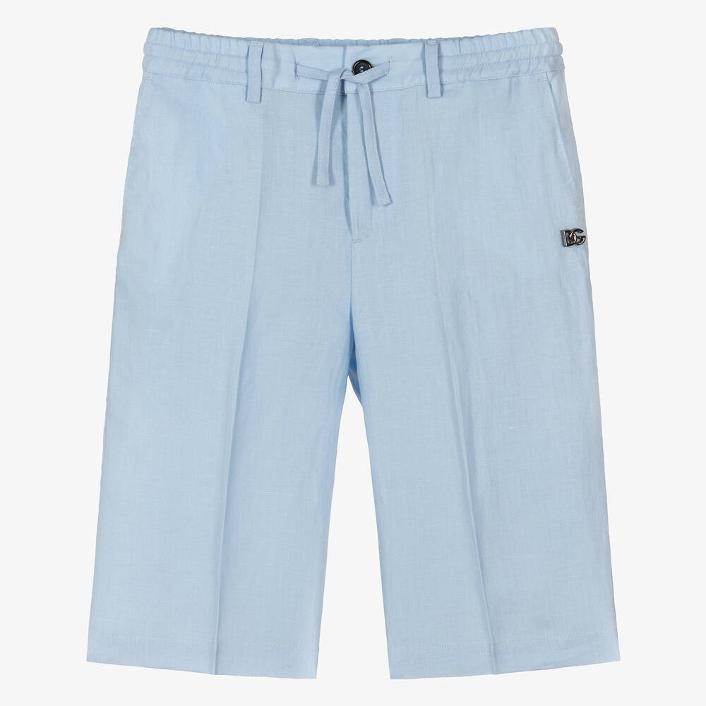 From Dolce & Gabbana, pale blue Bermuda shorts for teen boys with a gunmetal silver DG logo on the side seam for a designer touch. Traditionally styled for a smart-casual look, these luxuriously lightweight linen shorts fasten with a zip and branded button on the front. They have two slanted front pockets, two back pockets and a drawstring waist, for practicality and style.