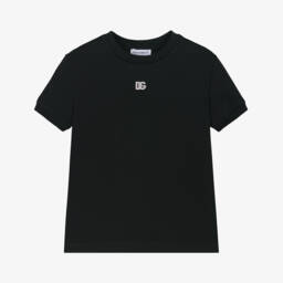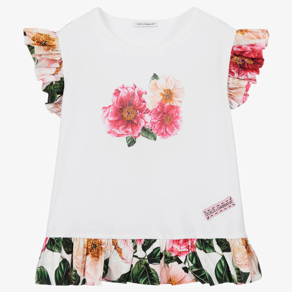 Teen girls white jersey T-shirt from Dolce & Gabbana, with a pink and black logo tab. This luxurious top reflects the designer's ideals of romanticism and femininity, with pink Camellia patterned ruffles and matching print.