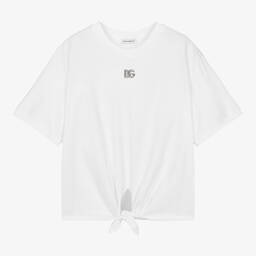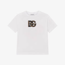 White vinyl leggings for teen girls by luxury Italian brand Dolce & Gabbana, with a gold DG charm on the hip. As seen in the main collection, they have a soft cotton jersey lining and concealed ankle zips. Soft and smooth, these flat fronted trousers have an adjustable waistband and fasten with a side zip.