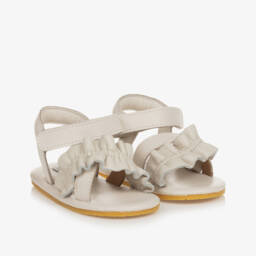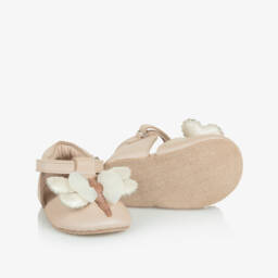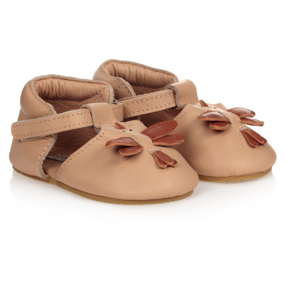 Charming beige shoes for baby girls by Donsje, handmade and fully lined in soft leather. Designed in a cute sparrow motif with brown trims, they fasten with velcro straps on the ankle. They have a suede leather outer sole on smaller sizes and a flexible rubber sole on larger sizes, perfect for taking those first steps.