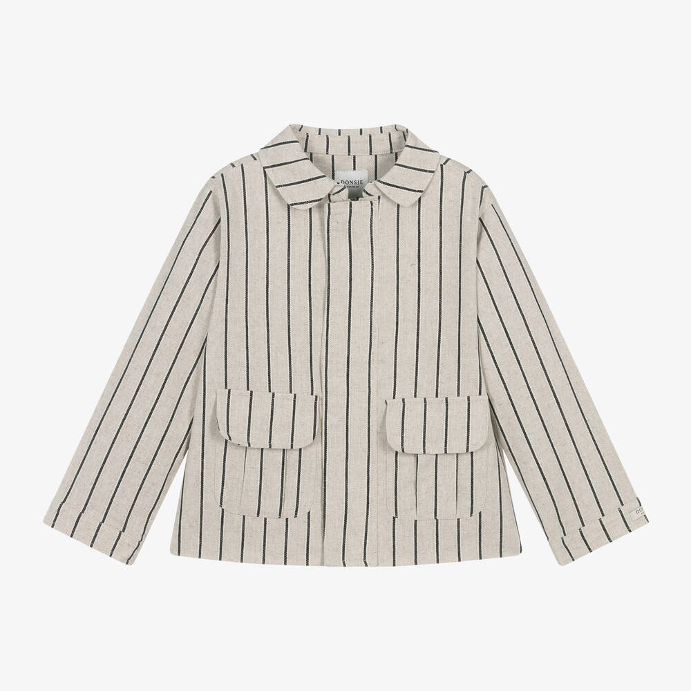 Smart beige jacket for boys by Dutch brand, Donsje. Softly woven in a cotton and linen blend, this understated style has a striped design, popper fastening utility pockets and a crisp, pointed collar. It is lined in soft cotton for breathable comfort, and fastens with a concealed zip on the front for a neat finish.