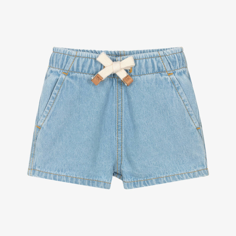 Light blue shorts for baby boys by Dr. Kid, made in soft denim with contrast stitching. These casual shorts have slanted front pockets and a drawstring waist for a comfortable fit around little tummies.