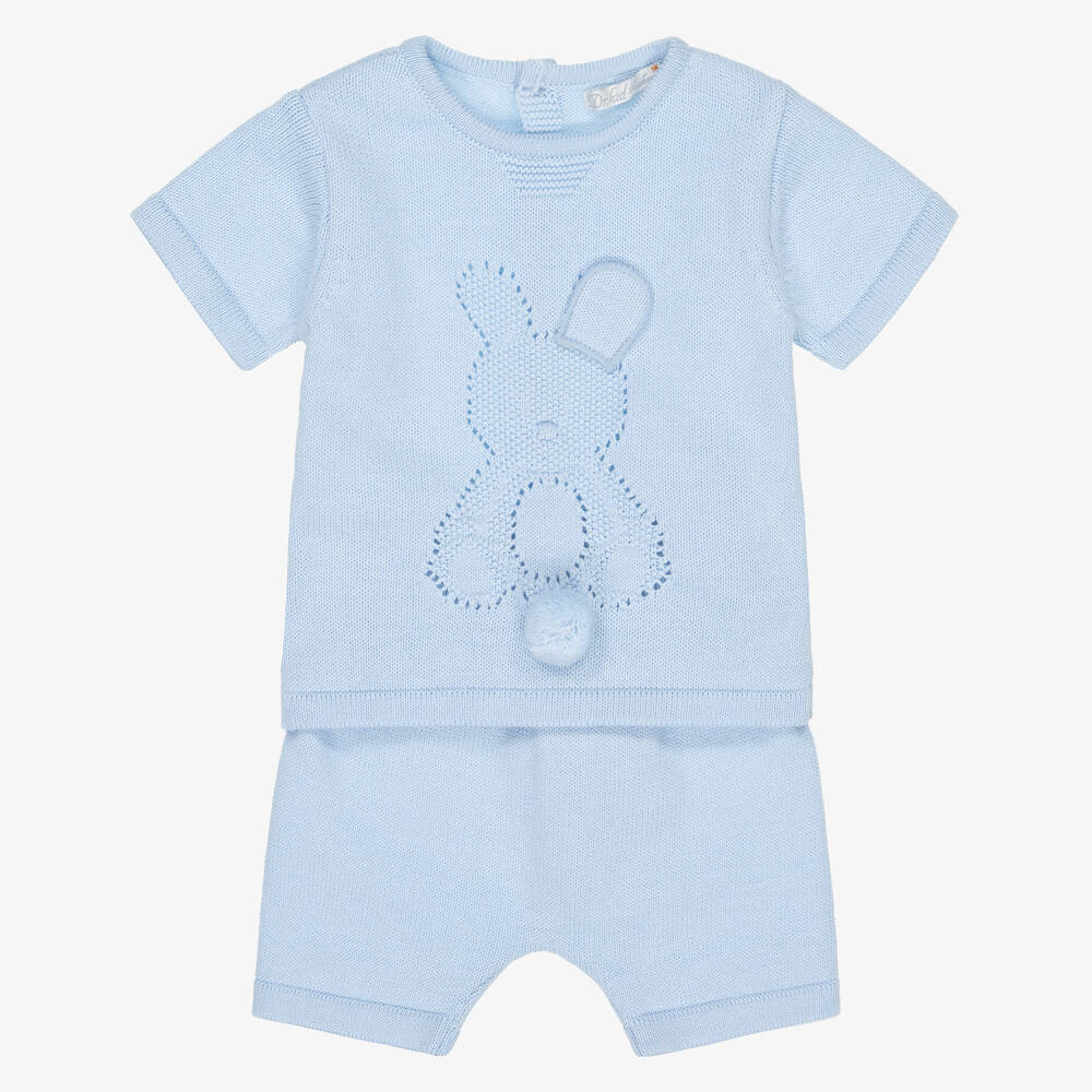 Sky blue shorts set for baby boys by Dr. Kid, knitted in soft cotton. The sweet top has an embroidered bunny motif on the front with a cute pom-pom tail. Stretchy shorts complete the look with comfort on little tummies.