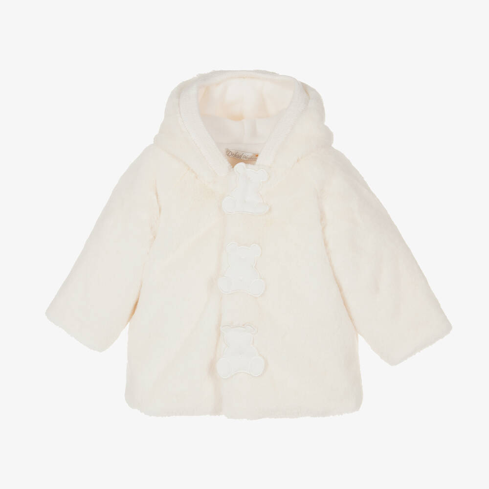 A cosy ivory pram coat for baby boys and girls by Dr. Kid. Made from super soft faux fur with a microfleece lining, it has a stretchy ribbed trim around the hood for added comfort. It fastens with concealed poppers on the front and has appliqué teddy bear patches for an adorable finish.