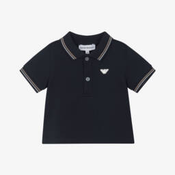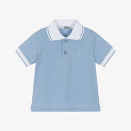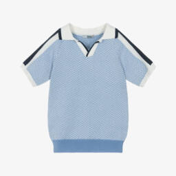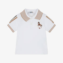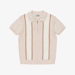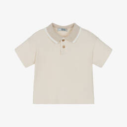 Nautical-inspired ivory polo shirt for little boys by Dr. Kid. Knitted in soft cotton, this short-sleeved style has navy blue stripes and natural wooden buttons on the front.