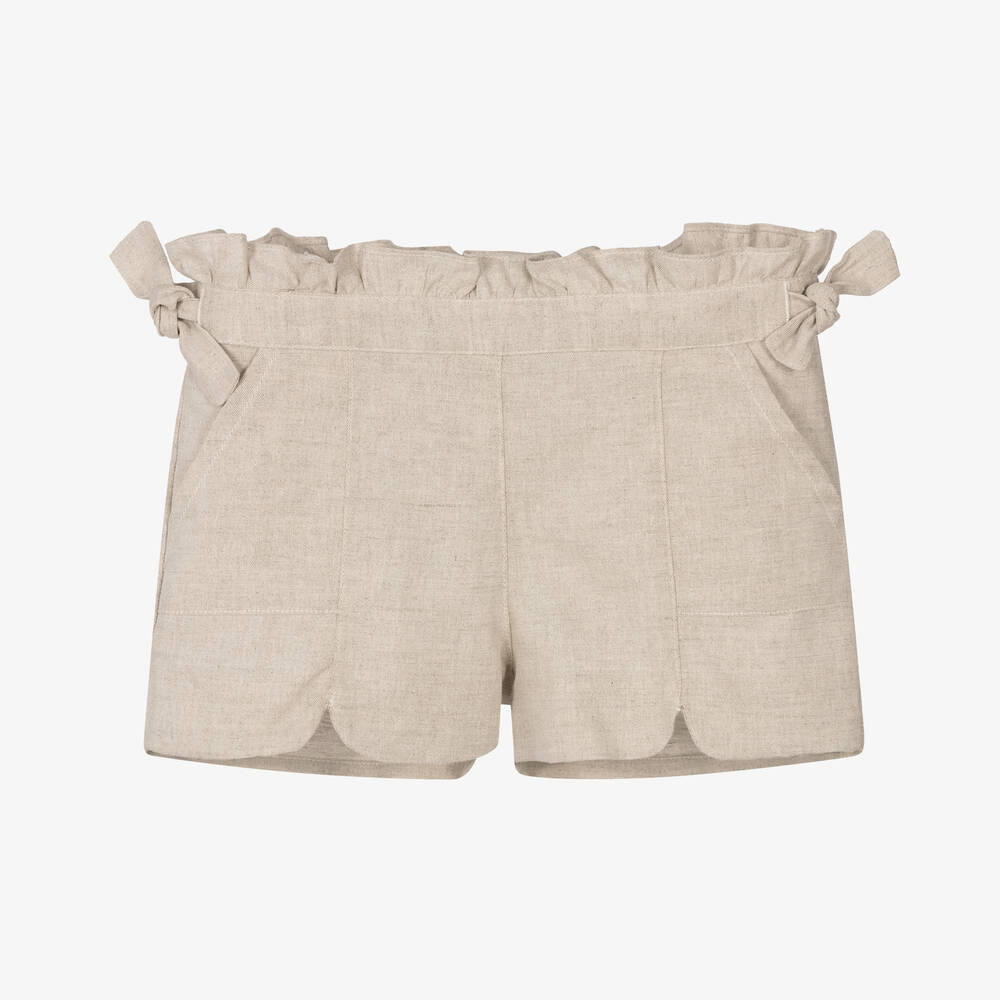 Smart beige shorts for girls from Dr. Kid, made in lightweight linen blend. They have a lightly ruffled waist with bowed ties on each side for a fun finish. Easy to pull on the waistband is lightly elasticated on the back for comfort.