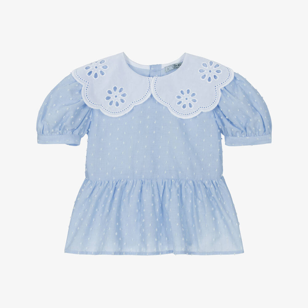 Light blue blouse for girls by Dr. Kid, woven in a lightweight cotton blend. This charming piece has short puffed sleeves and textured dots for unique detail. The oversized collar is embroidered with ladder lace trims and cutwork flowers for a beautiful finish.