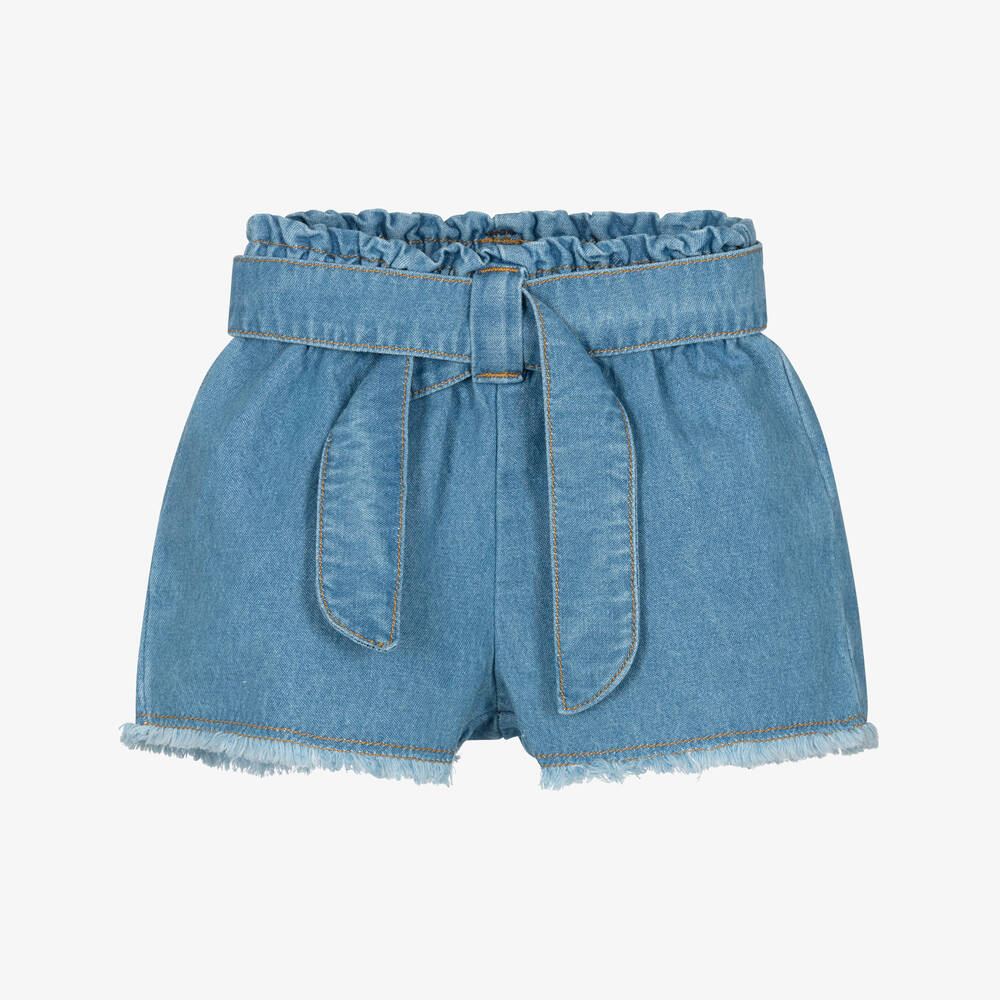 Casual blue denim shorts for little girls by Dr. Kid. Styled with frayed edges and a detachable, tie-up belt around the waist, these cute shorts have an elasticated waistband for comfort.