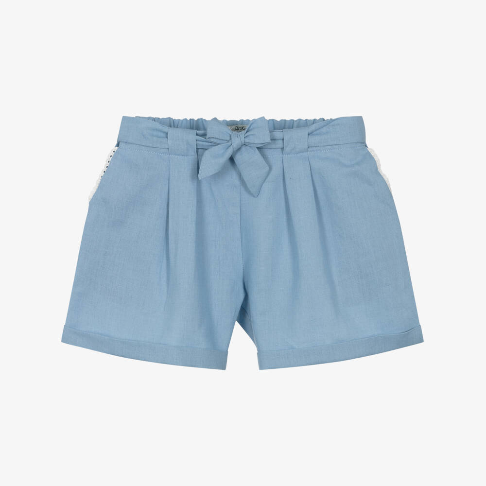 Blue shorts for girls by Dr. Kid, woven in a lightweight linen and cotton blend. For sunny-day style, these lovely shorts have turned-up cuffs and delicate lace trims on the two side pockets. They have a drawstring waist for a comfortable fit.