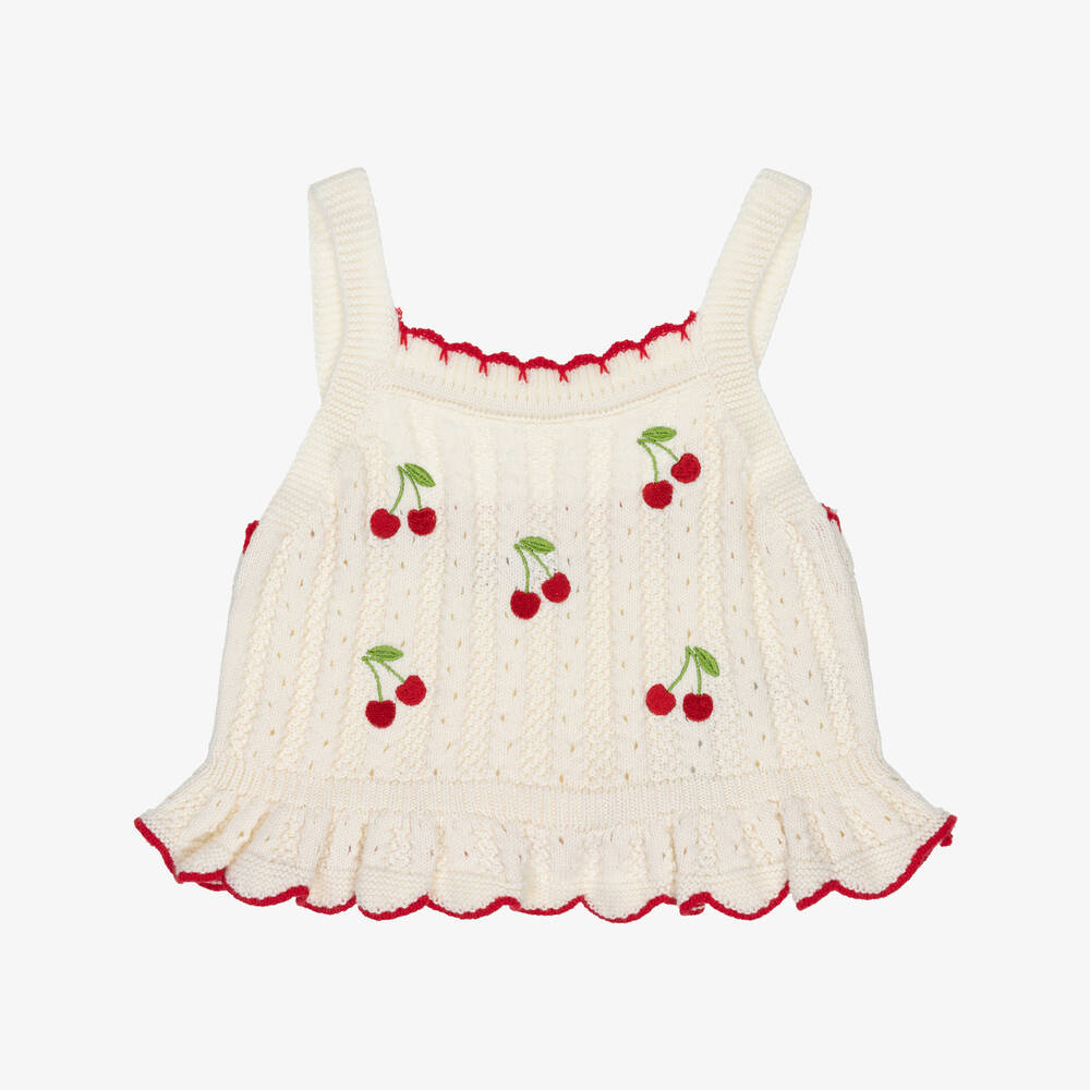 Cute ivory top for girls by Dr. Kid, knitted in soft cotton. Embroidered with sweet cherries, this pretty style has delicate scalloped edging and a ruffled, peplum hem.