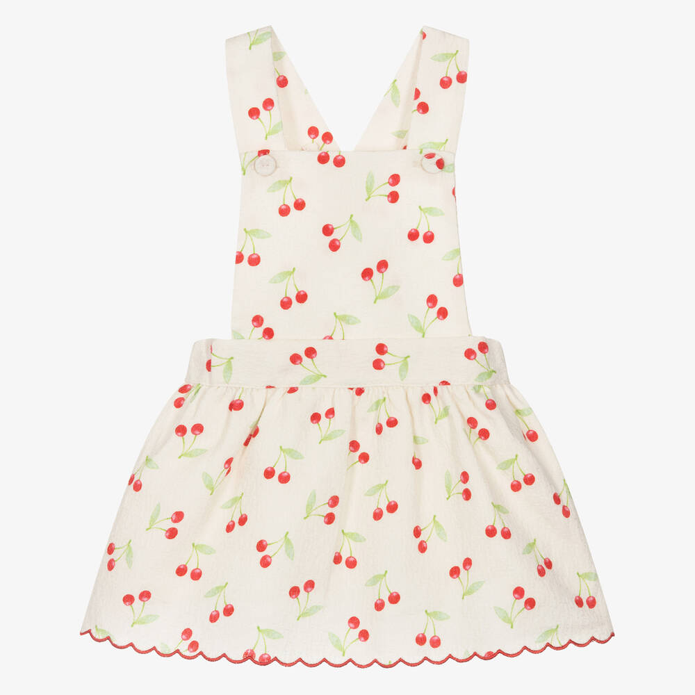 Little girls ivory cotton pinafore dress by Dr. Kid. Printed with playful cherries, it has a sweet scalloped hem and button fastening shoulder straps. The skirt is lined in soft cotton voile and the waist is adjustable for ultimate comfort.
