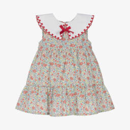 A classic dress for girls from Dr. Kid, patterned with pink, lilac purple and burgundy red ditsy florals. Made and lined in lightweight cotton, it has fabric-covered buttons on the front and sleeves for neatness. This smart and traditional dress has a shirred panel designed to look like smocking, a broderie anglaise collar, and a ruffle hem.
