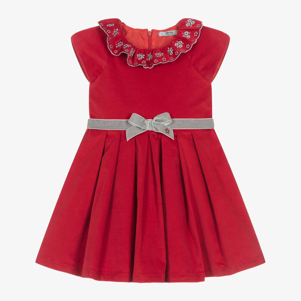 Red velvet dress for girls from Dr. Kid, made in soft velvet and detailed with diamanté. A classic style, this capped-sleeve dress has a ruffle collar with floral embroidery and a grey velvet bow affixed to the waist. The lining is silky satin, the skirt is pleated for movement, and the back zip is hidden for neatness.