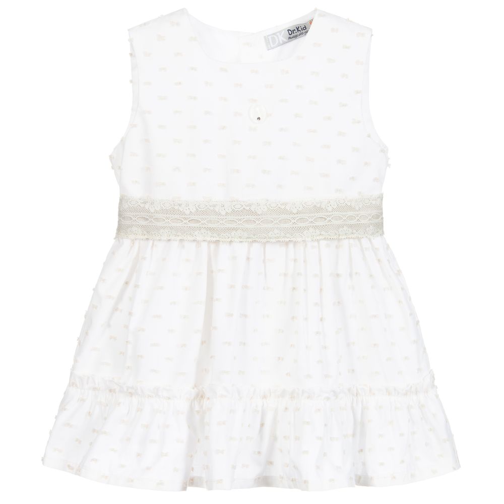 Ivory dress for little girls by Dr. Kid, made in soft cotton with beige plumeti details. There is a ruffle trim along the hem with a beige and ivory lace trim on the waist.
