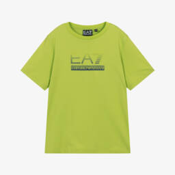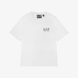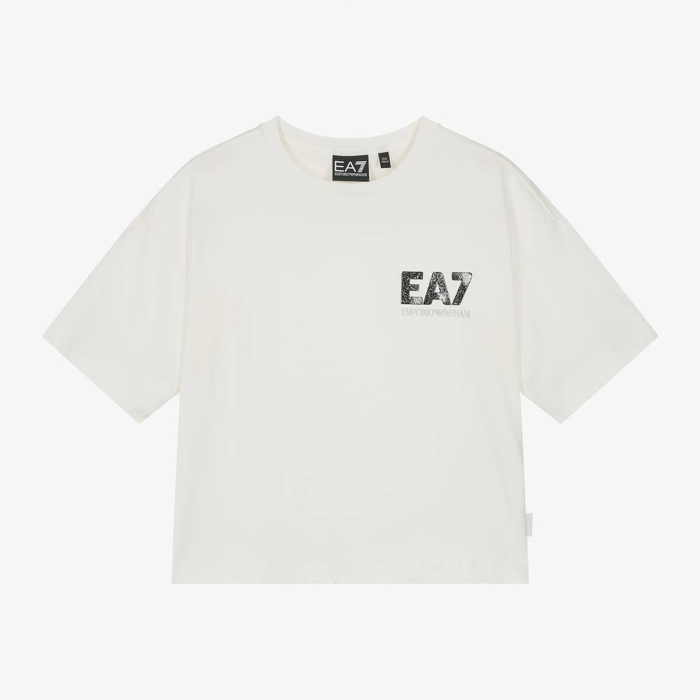 Ivory T-shirt for girls by EA7 Emporio Armani, made in soft cotton jersey. In a relaxed, boxy fit, this comfortable top has a rubberised, glittery black EA7 logo on the chest adding a stylish designer touch.