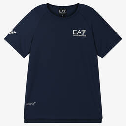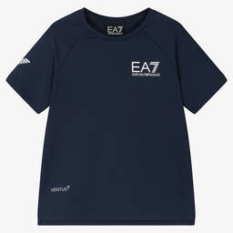 Navy blue cotton T-shirt for girls by EA7 Emporio Armani, with a distinctive pink and white EA7 logo graphic on the front. Designed in a stylish boxy fit, this cool top is made in soft jersey for comfortable wear.