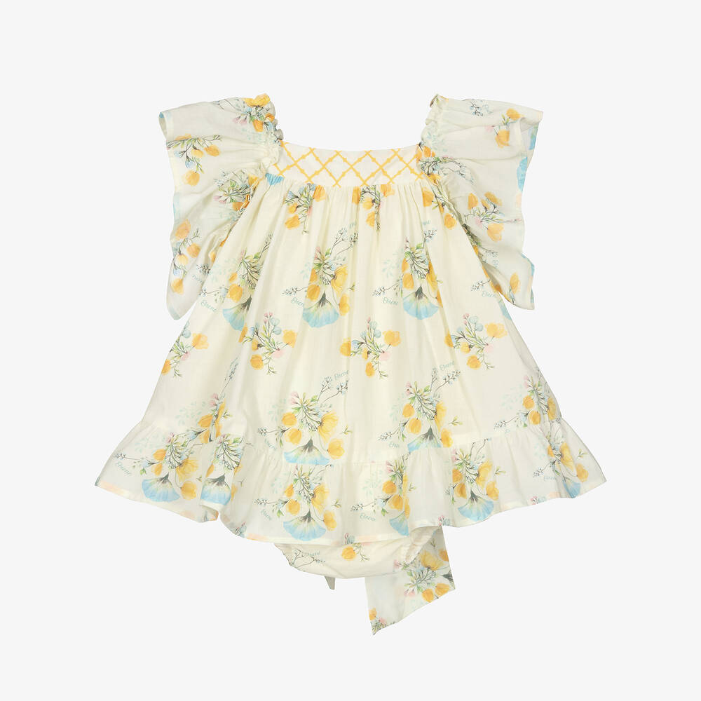 Pretty pale yellow dress for baby girls by EIRENE. made in soft, lightweight cotton. It is patterned with a lovely yellow, blue and pink floral pattern with blue script logos. With a lightweight lining for comfort, it has a frilled hem, floaty short sleeves and a large bow tied at the back. It fastens neatly on the back with a concealed zip and comes with a matching pair of knickers to complete the look.